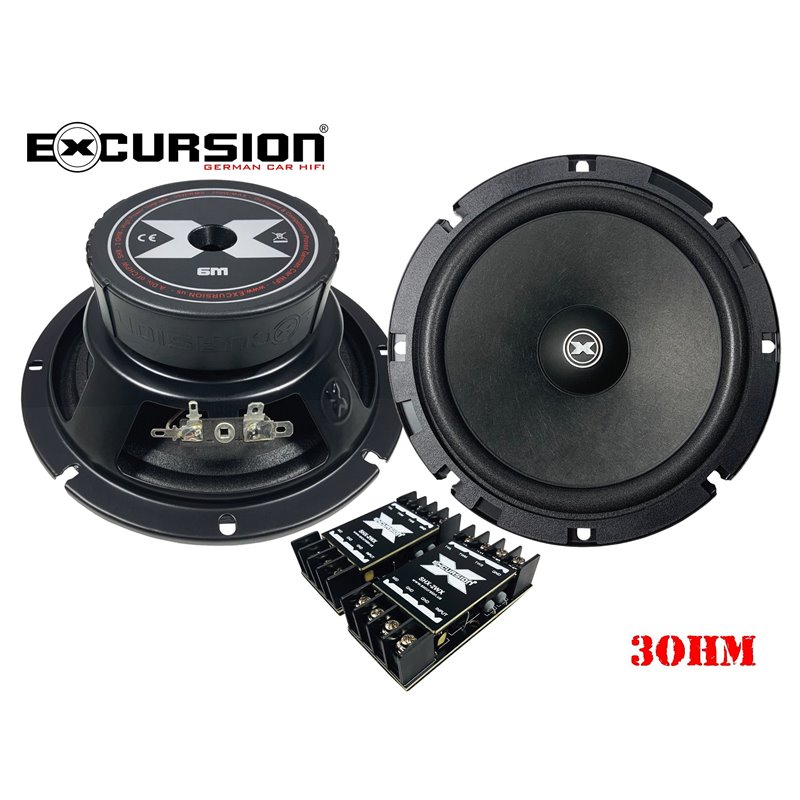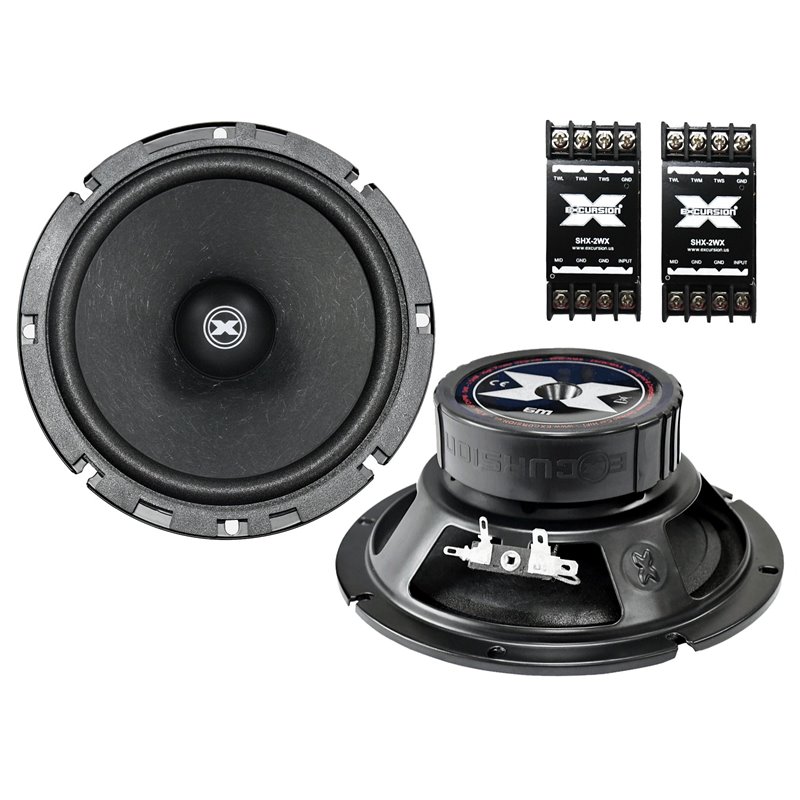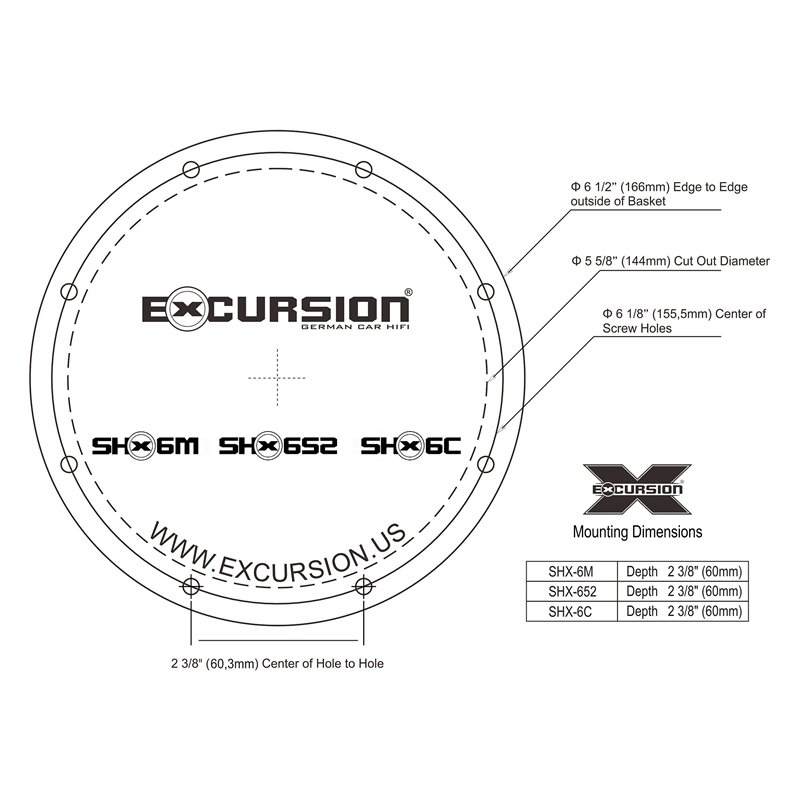 Samochodowe głośniki średnio-niskotonowe (mid-woofery) o średnicy 165 mm marki Excursion z serii SHX (Street High Power eXcursion). Głośniki z serii SHX, to bardziej zaawansowane brzmieniowo produkty o podwyższonej wydajności przeznaczone do uniwersalnych zastosowań oraz jako zamienniki fabrycznych systemów głośnikowych (OEM). W porównaniu do cieszących się bardzo dobrą opinią głośników z niższej serii SX, mid-woofery SHX prezentują znacznie dojrzalszy i bardziej dynamiczny charakter brzmienia. Wyższa moc wzmacniacza przeważnie zawsze zapewnia lepszą kontrolą głośników. Z tego powodu impedancja cewek mid-wooferów SHX została obniżona do 3 Ohm. Jest to jeszcze akceptowalna wartość przez większość standardowych radioodtwarzaczy i dobre systemy fabryczne. Dzięki temu można efektywniej wykorzystać każdy wzmacniacz, nawet wbudowany w radioodtwarzaczu, uzyskując z niego dodatkowo ok. 25% więcej mocy, co w praktyce przekłada się na bardziej dynamiczne brzmienie. Stożkowe membrany mid-wooferów wykonano z bardzo dobrego materiału, którym jest 2-warstwowy kompozyt papieru i naturalnej wełny z domieszką włókna szklanego. Sprawia to, że membrany są lżejsze ok. 10%, co skutkuje wyższą detalicznością brzmienia w zakresie średnich tonów oraz odczuwalną poprawą szybkości ataku fundamentu basowego (po wstępnym okresie docierania). Natomiast silniejszy o 25% wentylowany układ magnetyczny EFF (Efficient Flux Field) wraz z wydłużoną szczeliną cewki umożliwiają większe liniowe wychylenia membrany, zapewniając tym znacznie wyższą wydajność głównie w zakresie niskich tonów. Stalowe kosze mid-wooferów oraz aluminiowe karkasy cewek zostały wyposażone w dodatkowe otwory wspomagające system chłodzenia. Podobnie jak w serii SX, również membrany mid-wooferów SHX mają specjalnie ukształtowane nakładki przeciwpyłkowe (dustcap) w stylu korektorów fazy, których głównym zadaniem jest poprawa rozdzielczości brzmienia średnich tonów w przypadku większego kąta odsłuchu (np. przy nisko zamontowanych mid-wooferach drzwiowych). W zestawie znajdują się dwie 2-drożne zwrotnice pasywne pierwszego rzędu (HPF 6 dB/okt., LPF 6 dB/okt.) przygotowane do współpracy z opcjonalnymi głośnikami wysokotonowymi.