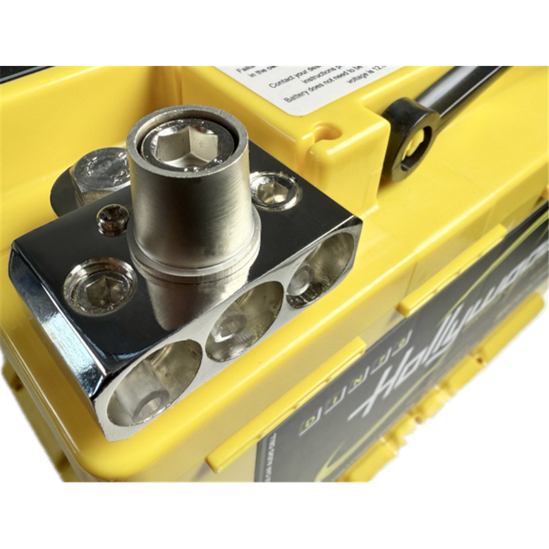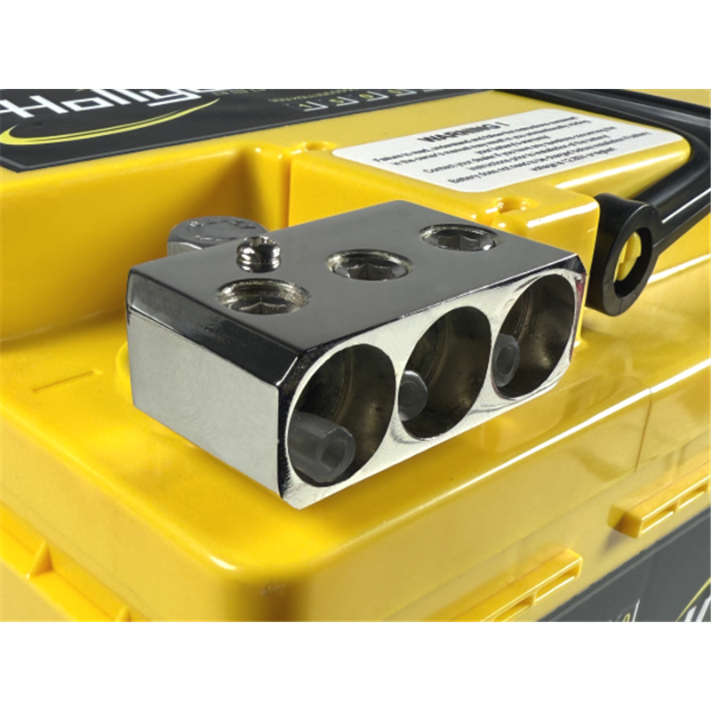 Terminal zasilania z serii Hollywood Energetic HPM (High Performance Metal) przeznaczony do profesjonalnych instalacji car audio o dużym zapotrzebowaniu na prąd. Umożliwia bezpieczne i stabilne rozdzielenie głównego przewodu zasilającego na kilka obwodów.