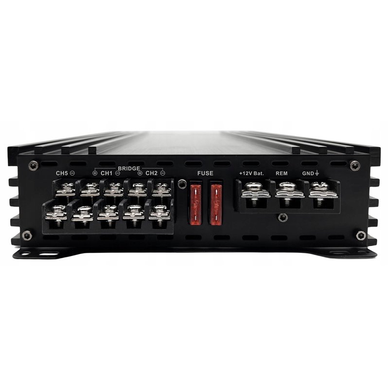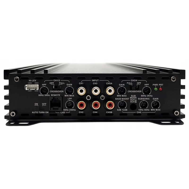 5-kanałowy wzmacniacz samochodowy o mocy 4x70-100W + 1x250/400W / Tryb zmostkowany (BRIDGED) 2x180W + 1x400W, stabilny do 2Ω, analogowy (klasa AB), wejścia sygnału Hi/Lo, Auto Turn On/Off, kompaktowe wymiary.